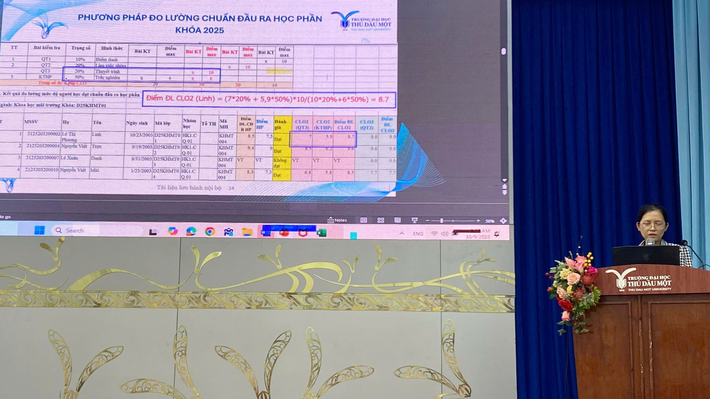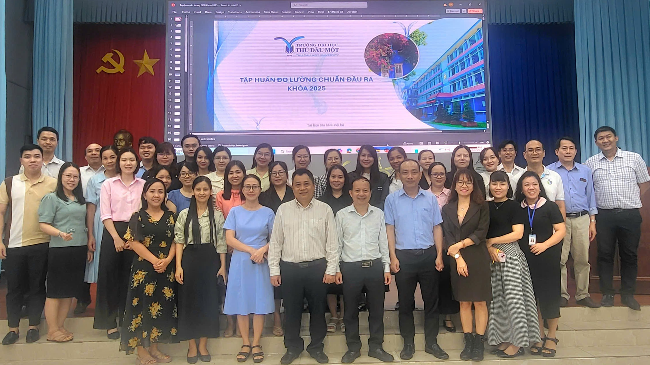 Nhằm triển khai đồng bộ và hiệu quả các cải tiến trong công tác đo lường, hướng tới nâng cao chất lượng giáo dục, sáng ngày 09/10/2025, Trường Đại học Thủ Dầu Một tổ chức buổi tập huấn chuyên đề “Đo lường chuẩn đầu ra học phần và chương trình đào tạo khóa 2025”. Tham dự chương trình tập huấn có TS. Trần Cẩm Thi – Trưởng Ban Đảm bảo chất lượng, lãnh đạo các đơn vị thuộc, trực thuộc; lãnh đạo các chương trình đào tạo cùng gần 200 giảng viên toàn Trường.